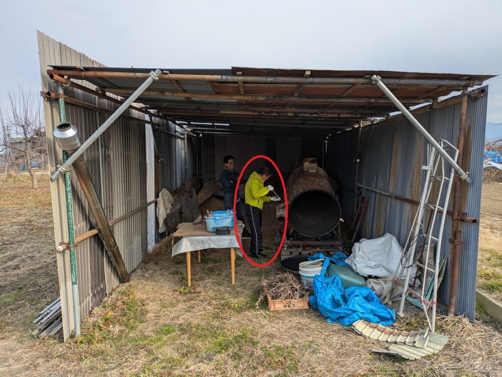 作業場を使わせてしてくださっている山崎さん(赤丸)は、敷地内に写真のような小屋を自作され、風雨を防ぎ作業がしやすい環境を用意してくださいました。