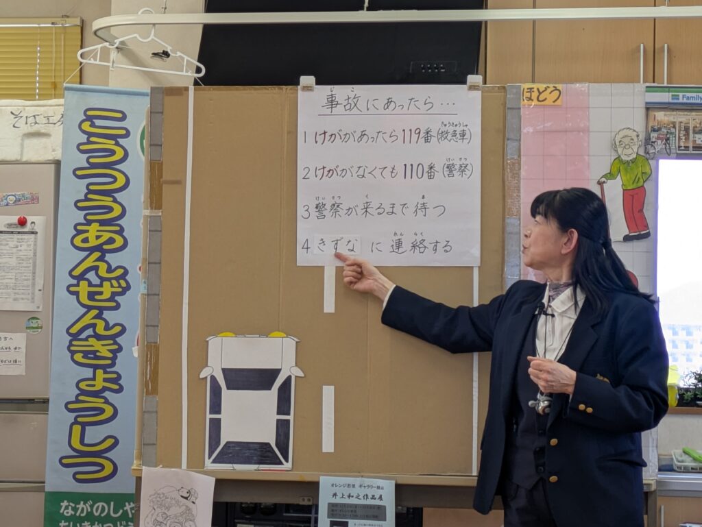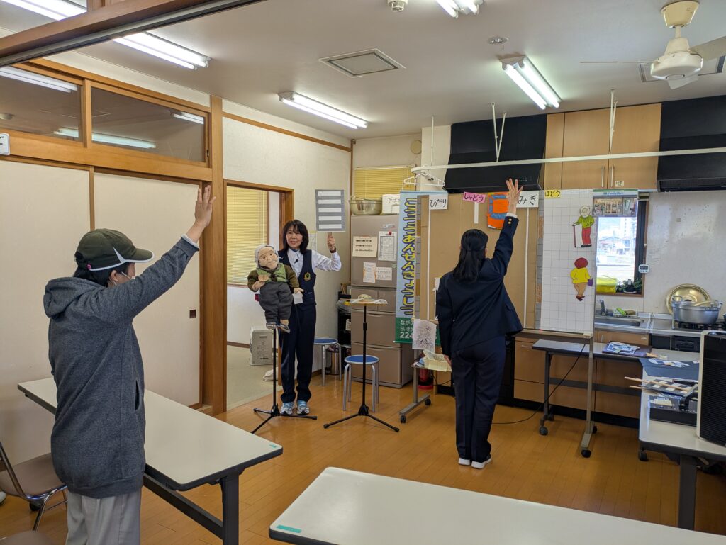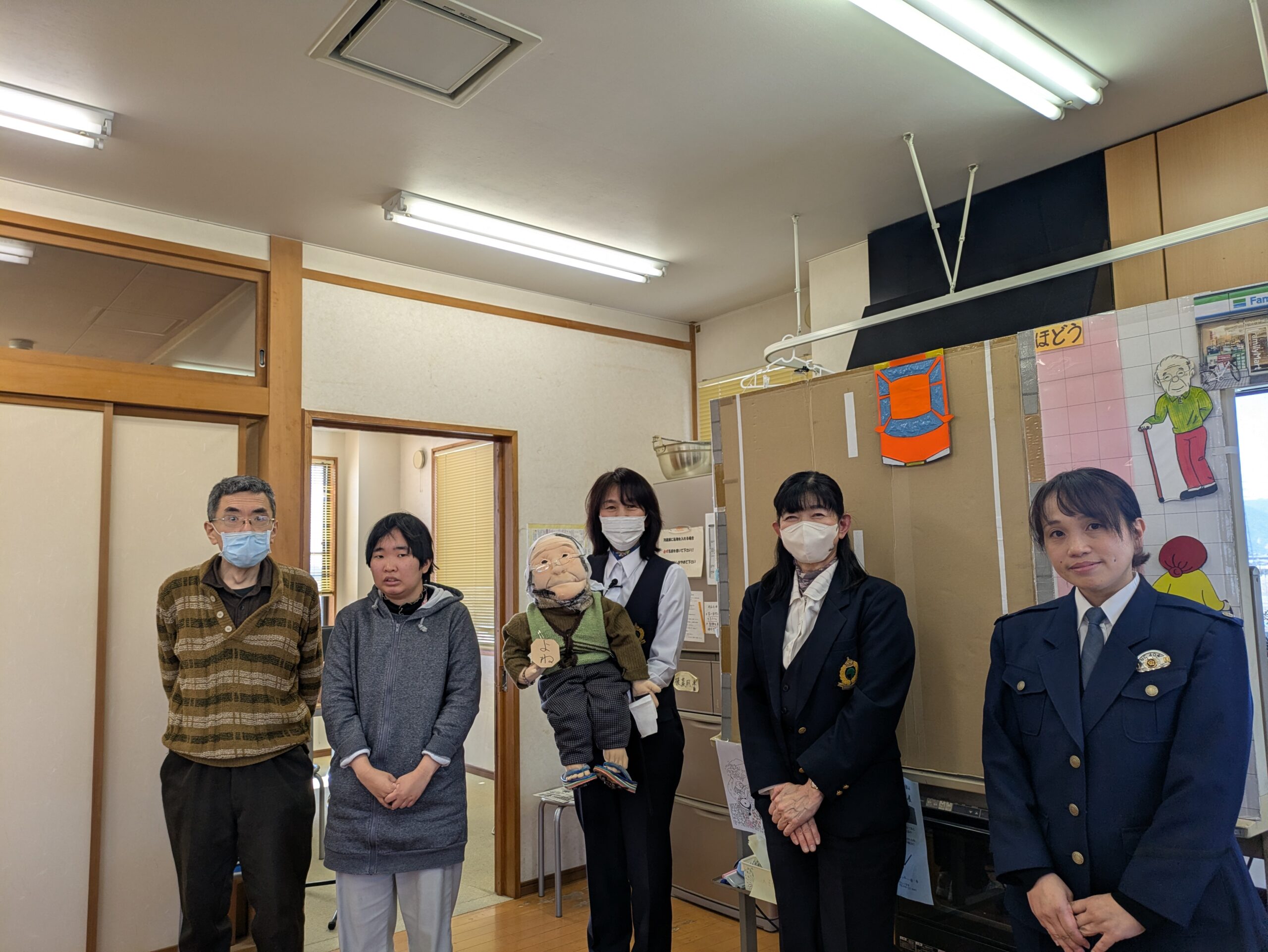 当日は、長野市役所地域活動支援課の北原さん、樋口さん、そして長野中央警察署の五味さんにお越しいただきました。講習には、豆大福が大好きな「よねばあちゃん」というお人形も登場!