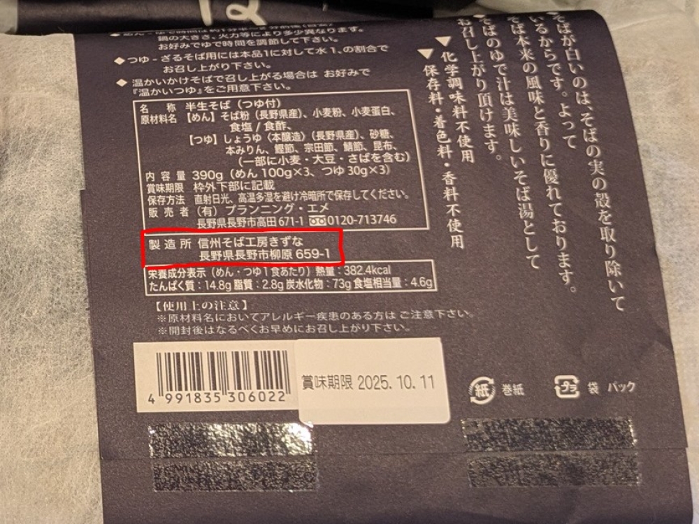 当然ですが製造所は「信州そば工房きずな」と書かれています。