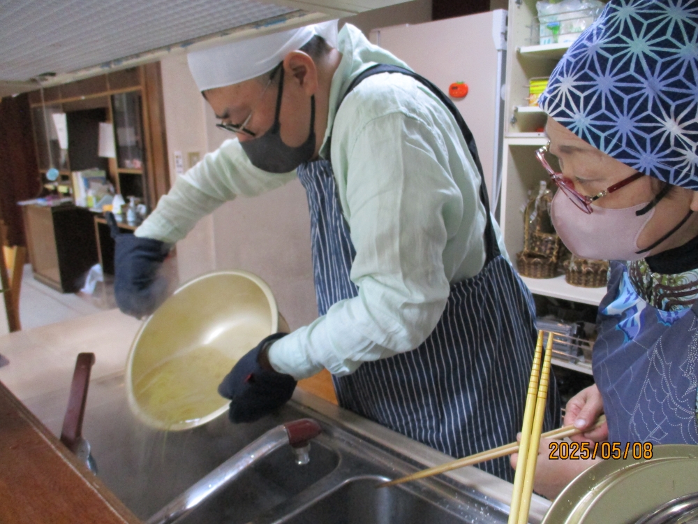 ・職員さんの指示を仰ぎながらやることができました。出来上がったナポリタン、サラダ、漬物、とても美味しかったです。ごちそうさまでした。 山口