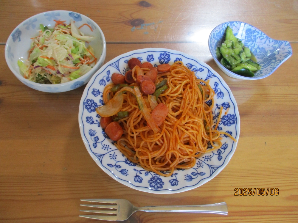 5月8日(木)のランチ会では、「ナポリタン」と「グリーンサラダ」「たたききゅうりのこんぶ茶あえ」を作りました。