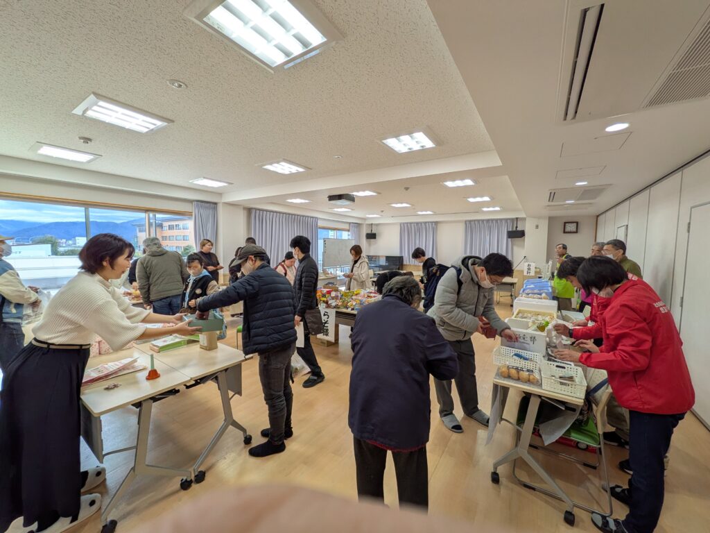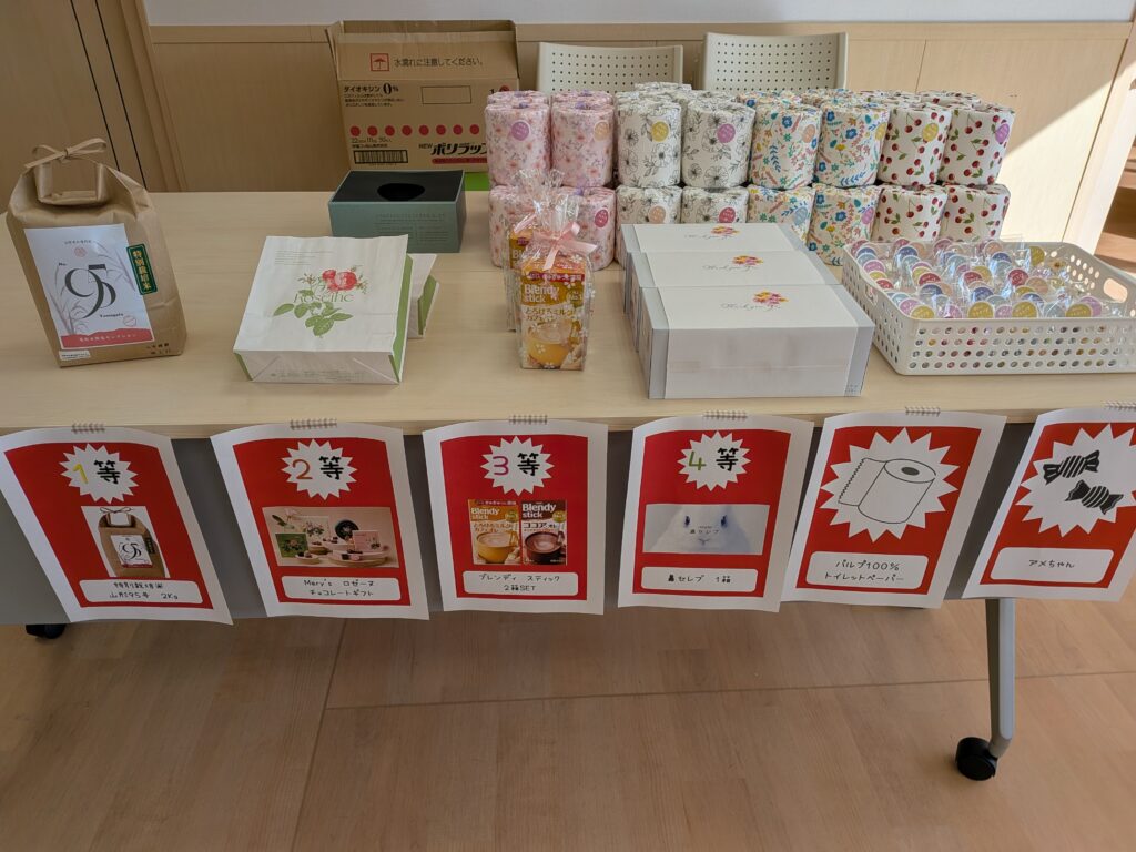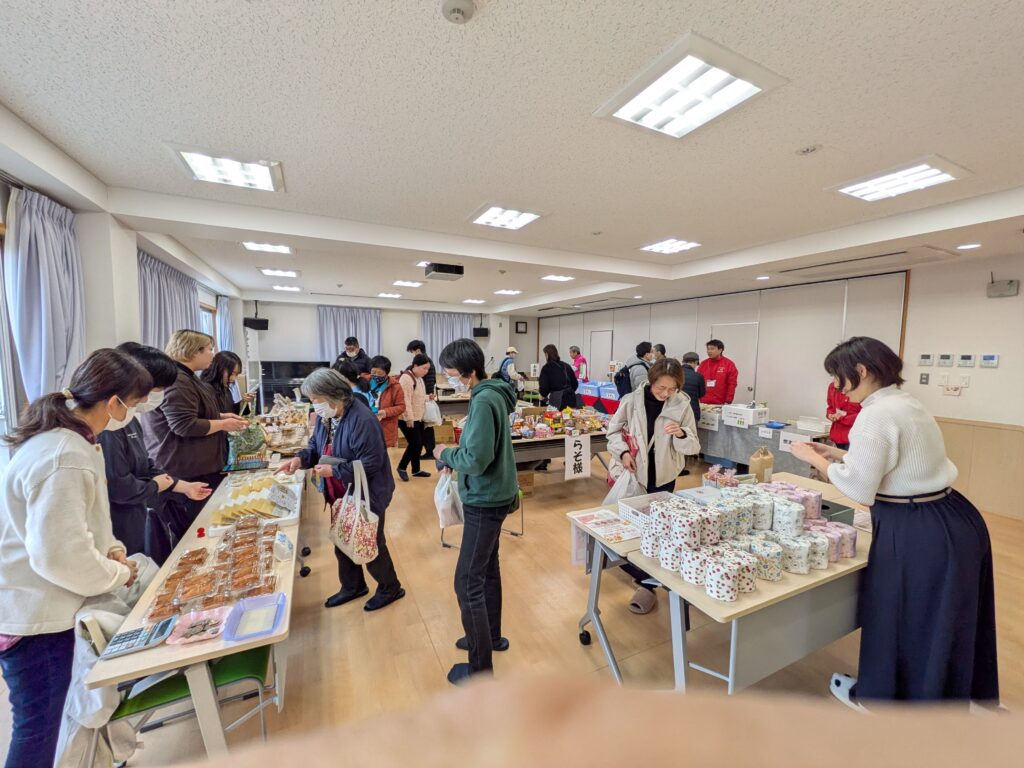 販売コーナーでは、今年も「だがし家らそ様」にご参加いただき、賑やかさを演出して頂きました。あらためて御礼申し上げます。また、法人内B型事業所からは感謝祭限定のものや普段なかなか買えない商品を販売したところ、「珍しい色の麺で面白いね」、「彩りがきれいなお菓子で春を感じるね!」といった感想をいただきました。買い物されたお客様が参加できるクジ引きでは、1等のお米をはじめ皆さん喜ばれていて、こちらも嬉しかったです。