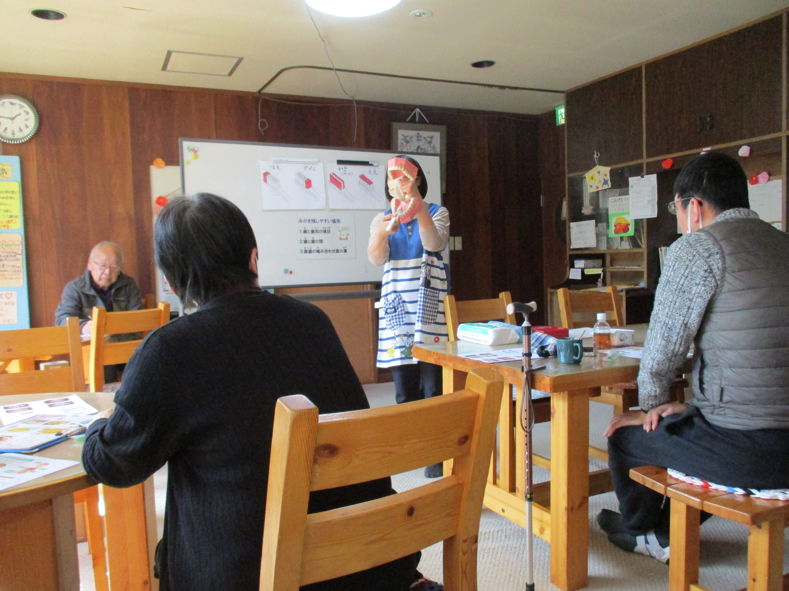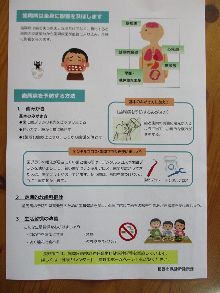 出前講座開催しました。 2026 3/10 行事 2026年3月10日 00:00 3月9日(月)は市政出前講座「歯周病予防のためのお口の健康づくり」~全身への悪影響と予防方法~というテーマで、 長野市保健所から歯科衛生士の方が講義に来てくださいました。 歯周病が身体に与える影響や予防方法、歯磨きの仕方など、 とても分かりやすく丁寧に教えていただきました! 参加したメンバーさん達は熱心に講義に聞き入り、質問がたくさん出て、 いろいろな疑問を解消することができました! お口の健康が全身の健康に関わってくるので、 正しい歯磨きは大事だなと改めて思いました! (オレンジ若里 川島) 行事 よかったらシェアしてね! URLをコピーしました! URLをコピーしました! ムーミン展に行ってきました。 スプリングクレールマルシェのお知らせ この記事を書いた人 社会福祉法人 絆の会 関連記事 悠友ハウス新年会 2026年3月12日 00:00 ムーミン展に行ってきました。 2026年3月9日 00:00 折り紙を楽しむ会 2026年3月7日 00:00 今年も感謝祭を開催しました! 2026年3月6日 00:00 手芸を楽しもう! 2026年3月4日 00:00 季節のお茶会開催しました! 2026年3月3日 00:00 モルックを楽しもう! 2026年3月2日 00:00 水彩画を楽しもう! 2026年3月1日 00:00