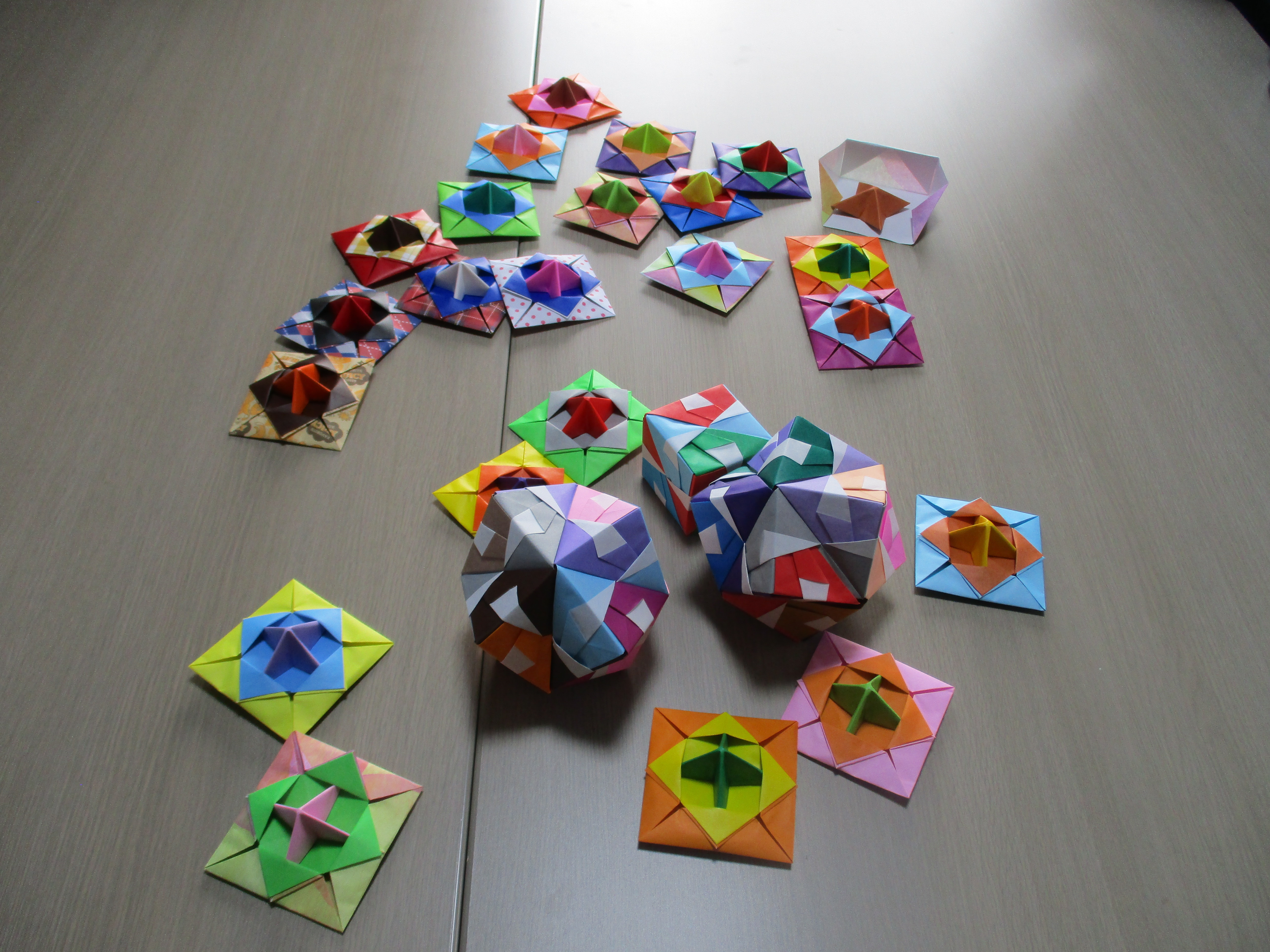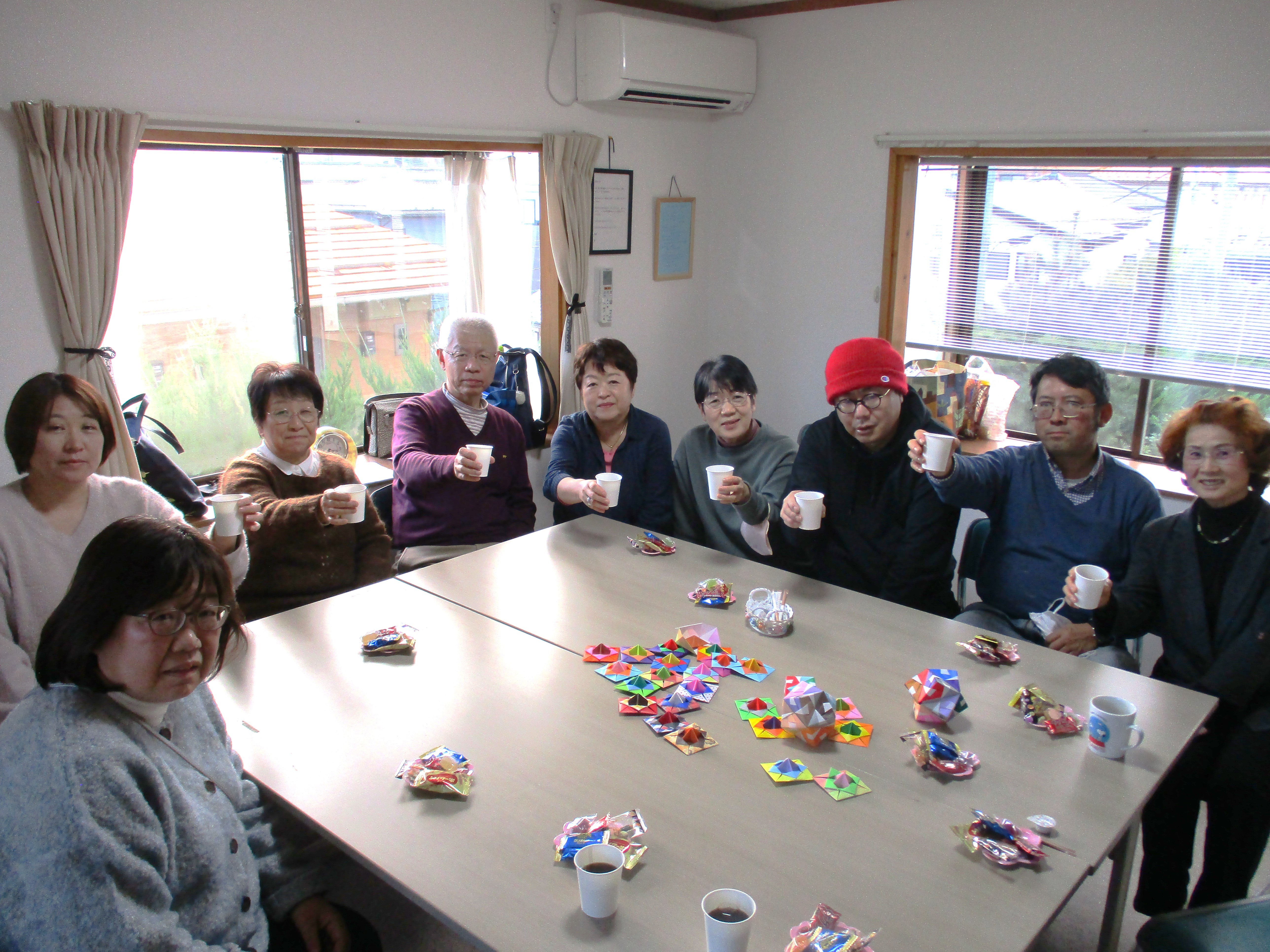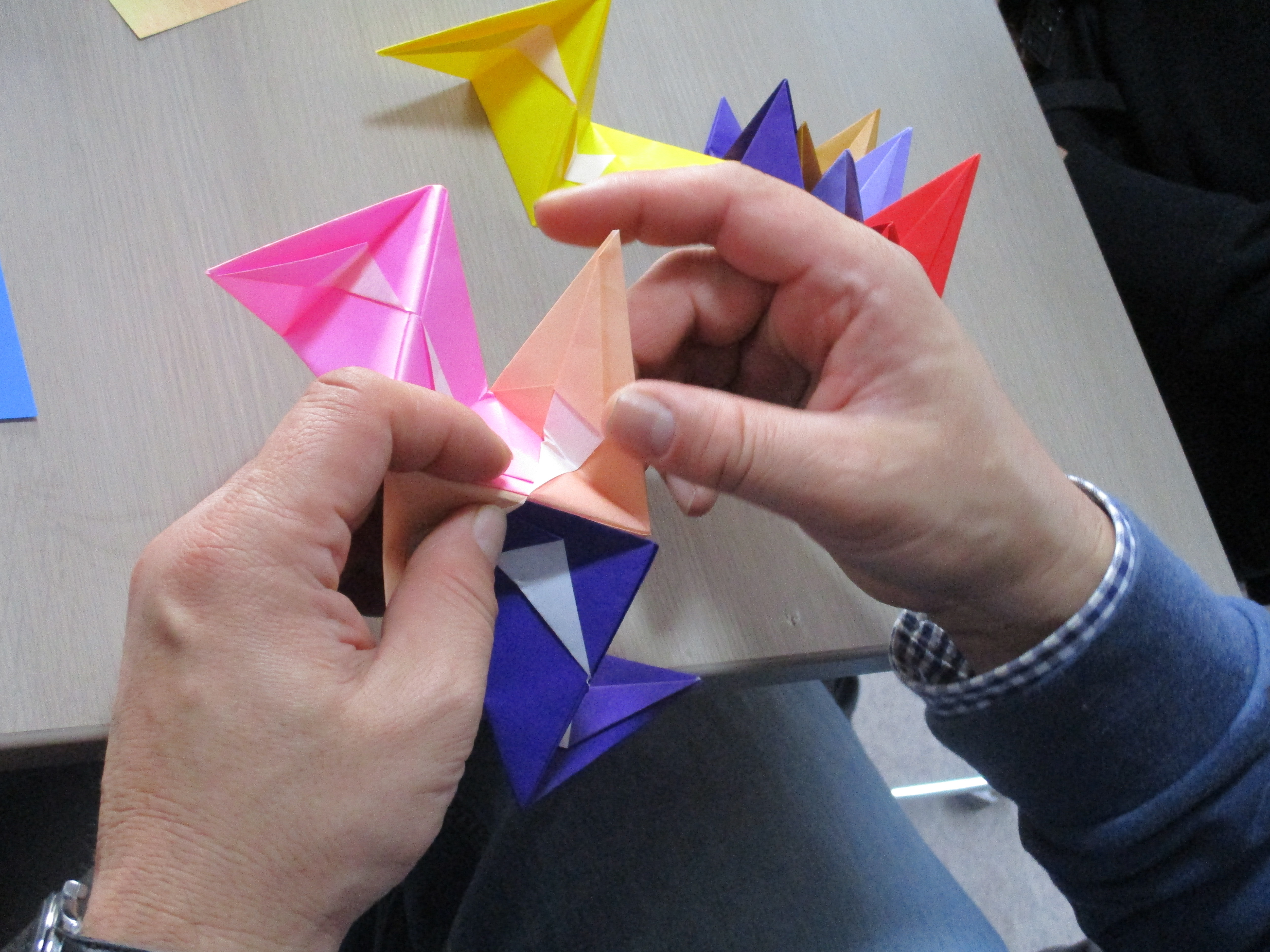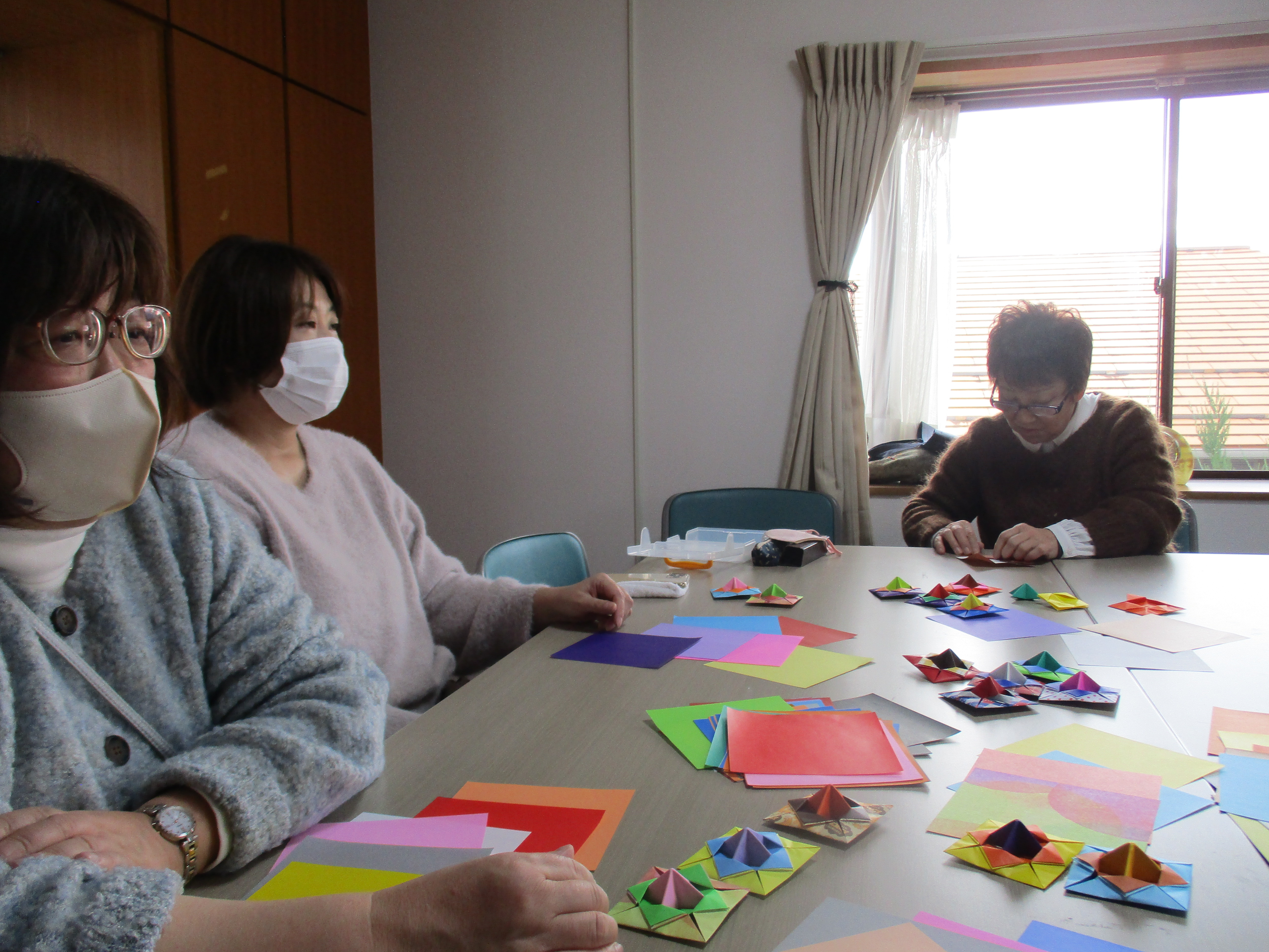 また、立体になる作品を作りました。参加者でパーツを作り、そのパーツを1つに合わせて立体の折り紙を完成することが出来ました。みんなのパーツが一つの形となり出来上がったときは一体感がうまれ、とても和気あいあいとした時間を過ごすことが出来ました。
