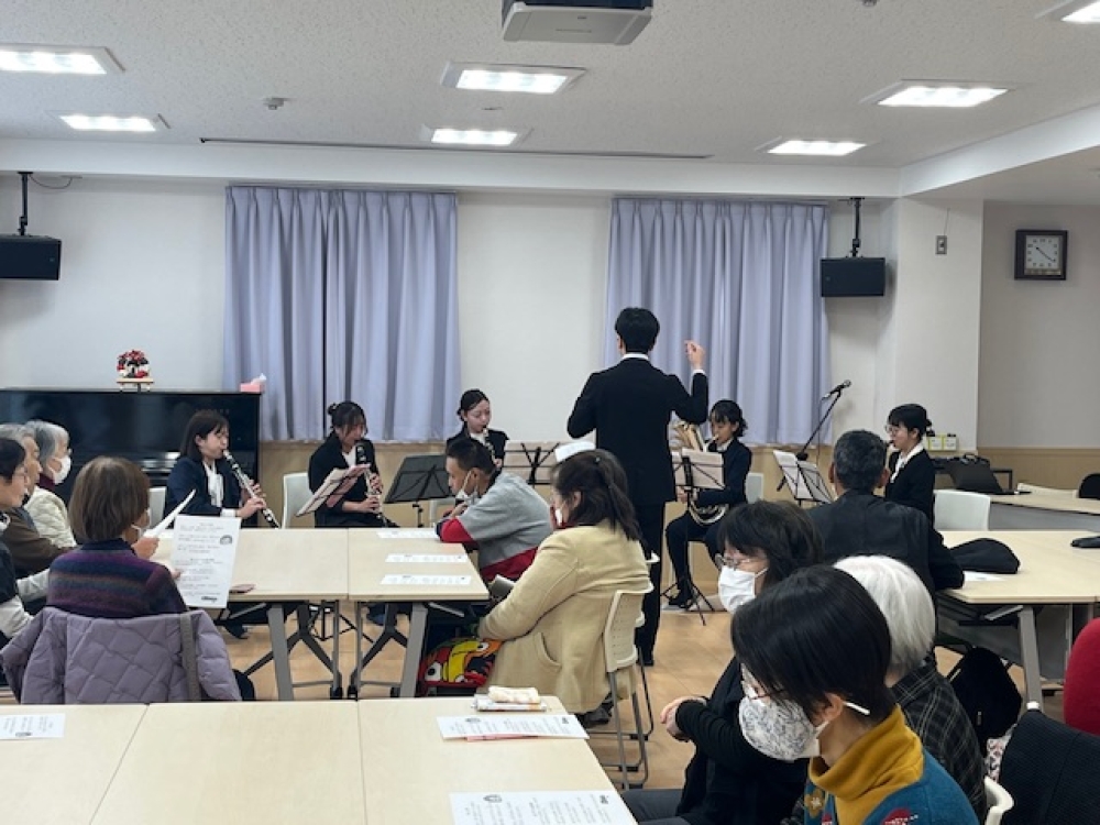 前半は、長野駅近辺に在住・在職する若手演奏家で構成された「栗田音楽団」の皆さんによる演奏会が行われました。「きよしこの夜」「見上げてごらん夜の星を」など5曲を演奏していただき、参加者全員で歌う場面もありました。アンコールではクリスマスキャロルが披露され、会場は一足早いクリスマスの雰囲気に包まれました。さらにリクエストに応えて楽器紹介もしていただき、音楽や楽器への理解を深める機会となりました。