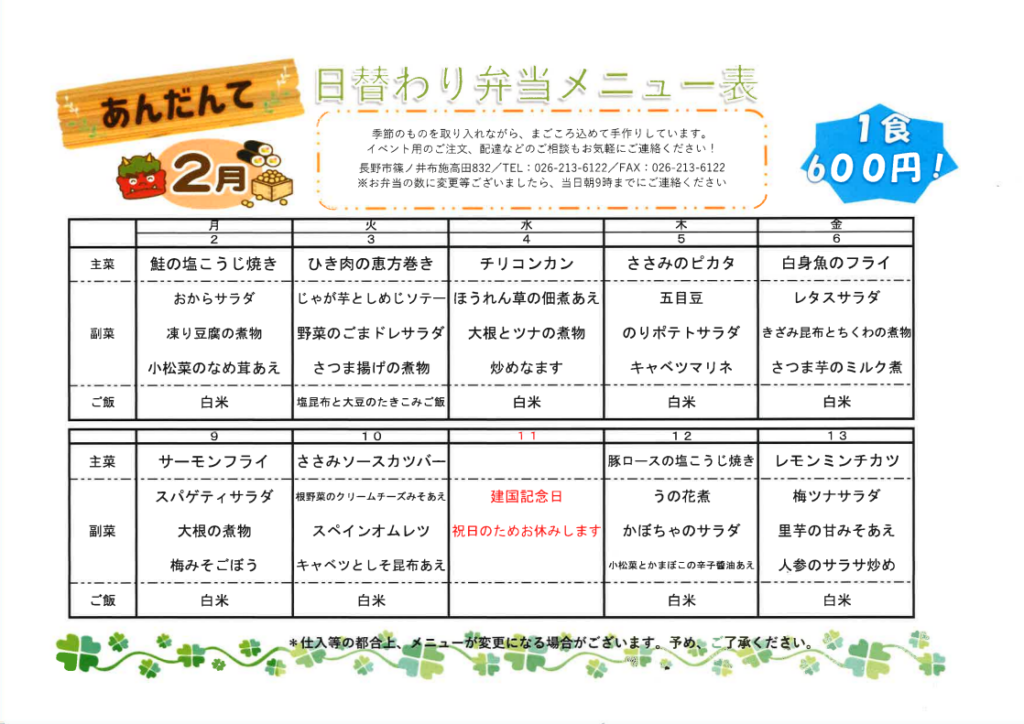 1772_001.pdfあんだんてより最新お弁当メニューのお知らせです。寒い日が続いてますね。いつもありがとうございます。あんだんてより2月上旬お弁当のご案内です。皆様のご利用お待ちしております。あんだんて 松本 -