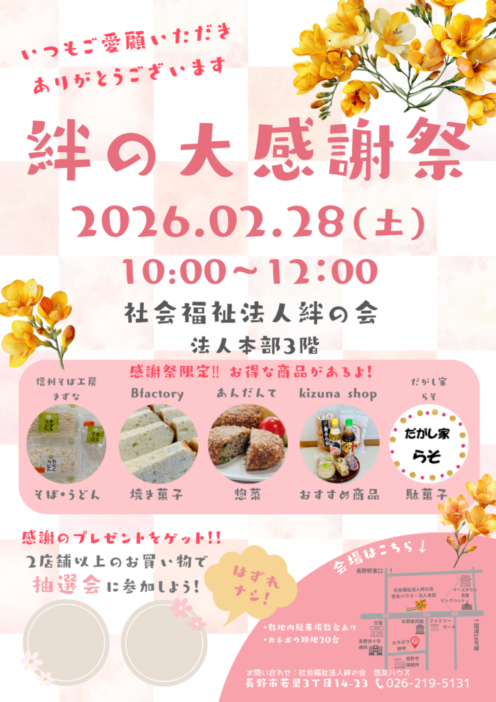 2月28日(土)10:00~12:00に絆の会法人本部にて「絆の大感謝祭」を開催します。 絆の会のB型4事業所(信州そば工房きずな、びーんず、あんだんて、悠友ハウス)が、地域の人と絆ショップをご利用の皆様に、日頃の感謝の意を込めて企画しました。 販売コ... -