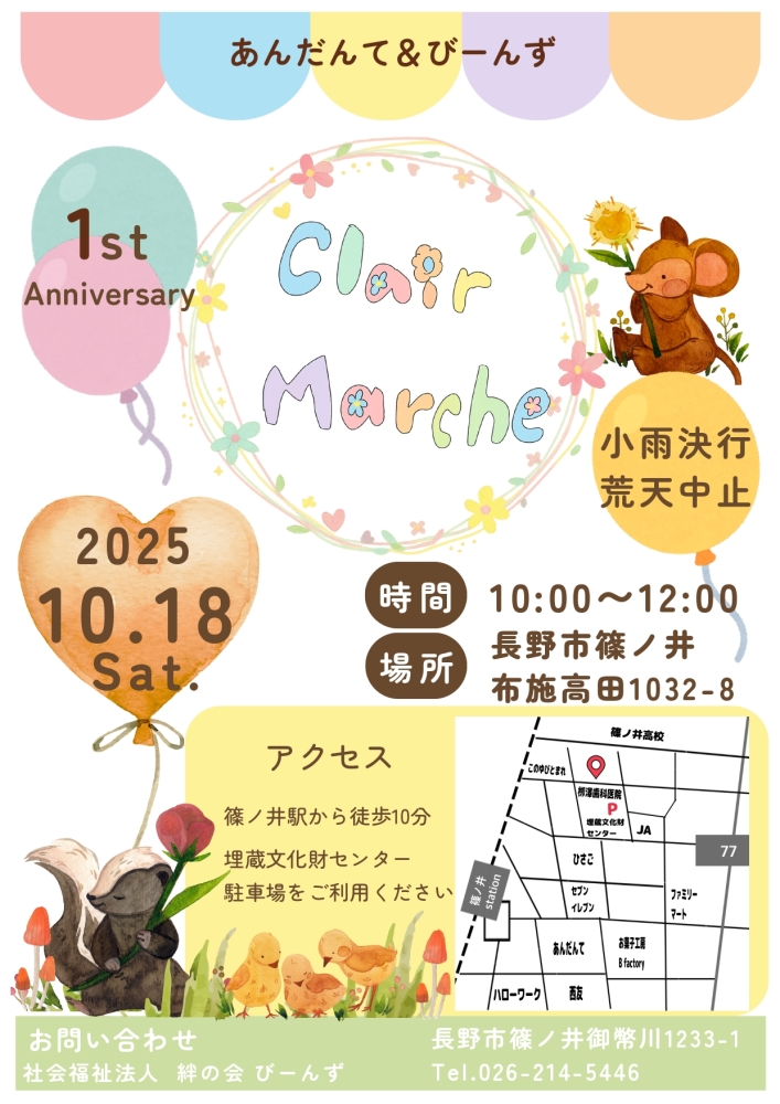 昨年からはじめてきたクレールマルシェもおかげ様で一周年を迎える事となりました(*^-^*) 本当にいつも支えて頂きありがとうございます。 今回【10月18日(土)】は一周年という事もあり、より感謝の気持ちをこめて販売品目を増やしたり お楽しみや体... -