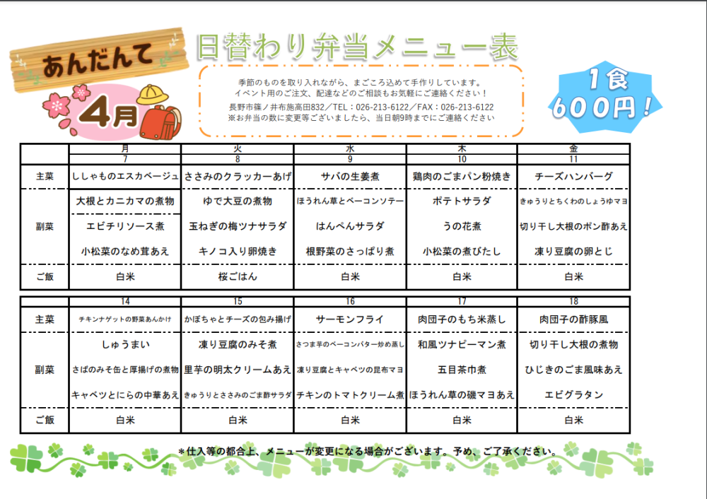 あんだんてより最新お弁当メニューのお知らせです 新年度を迎え、何かと慌ただしい時期になりますが みなさまいかがお過ごしでしょうか… 季節の変わり目、ご自愛ください。 来週もみなさまのご利用を一同お待ちしております あんだんて 松本 -
