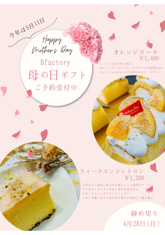 母の日ギフトのチラシが出来上がりました。 2025年は毎年人気のオレンジロールと 新たにウィークエンドシトロンが登場!! どちらも柑橘の甘酸っぱさとさわやかな香りが美味しいケーキです。 お母さんへ感謝の気持ちを込めてはもちろん 日々家事やお仕... -
