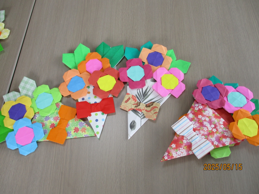5月15日水曜日の午後 昨年より来ていただいている降幡治子さんと「折り紙を楽しむ会」のみなさんと折り紙カフェを開催しました。 今回は、花束を教えてもらいました。 「やっこさん」を折ってからお花に変わっていく過程がとても楽しい折り紙でした。 次...