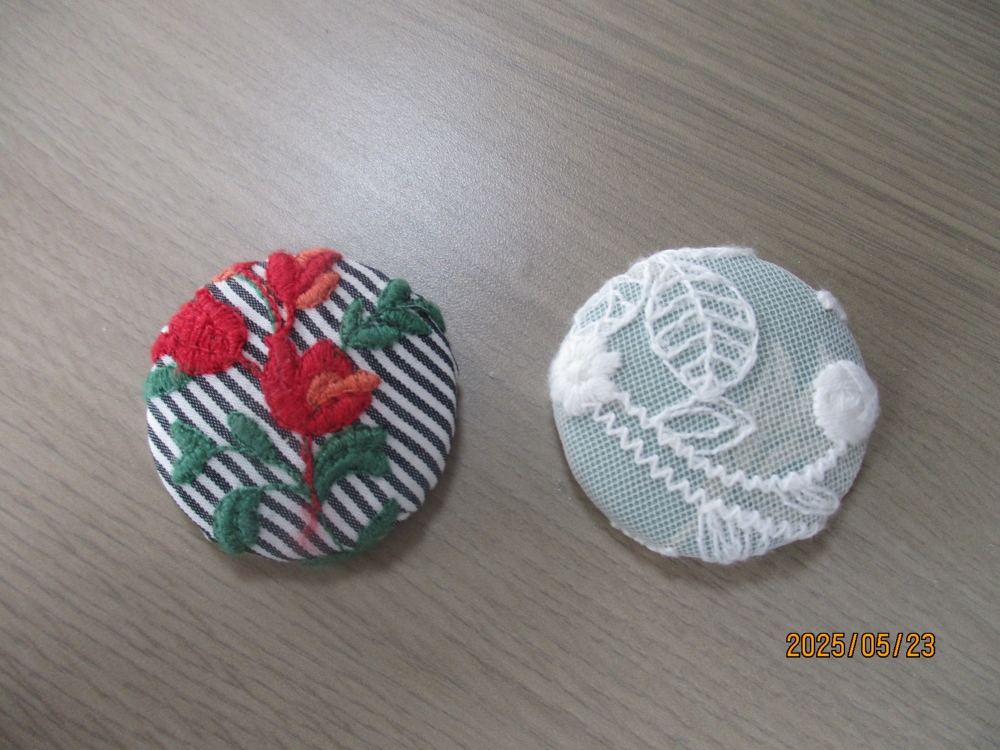 5月23日(金)にシニアエイトの方から教えてもらいながらブローチ作りを行いました。 様々な布の中から自分の好きな柄を選んで型紙に沿って切り、周りを縫い縮めてくるみボタンを包んで作りました。布のどこの刺繍を使おうか、レース生地と2枚重ねてみよ... -