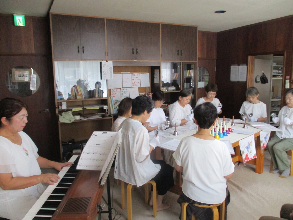 9月10日にはアップルベルズの皆さんによるハンドベル鑑賞会が行われました。 茶摘みや旅愁、ミッキーマウスマーチなどの演奏をお聴きした後、ハンドベルの伴奏に合わせてふるさとを歌ったりしました。 後半は全員で虫の声の演奏に挑戦しました。3人ずつの... -
