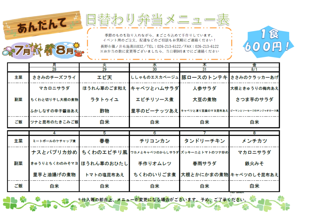 あんだんて最新お弁当メニュー表