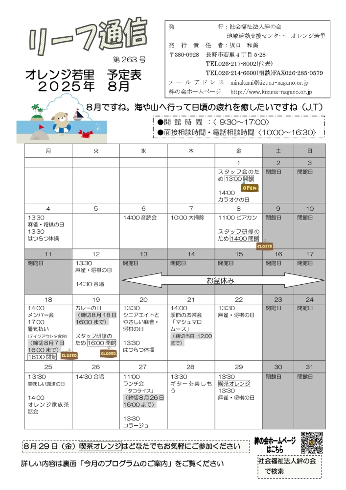 美味しい珈琲の日 日時:8月25日(月)13:30~ 場所:オレンジ若里 シニア大学の中山さんとその仲間たちの挽きたての 美味しい珈琲を飲みませんか 喫茶オレンジ 日時:8月29日(金)13:30~15:30 ボランティアのみなさんや地域の方々との交流の場です。 淹... -