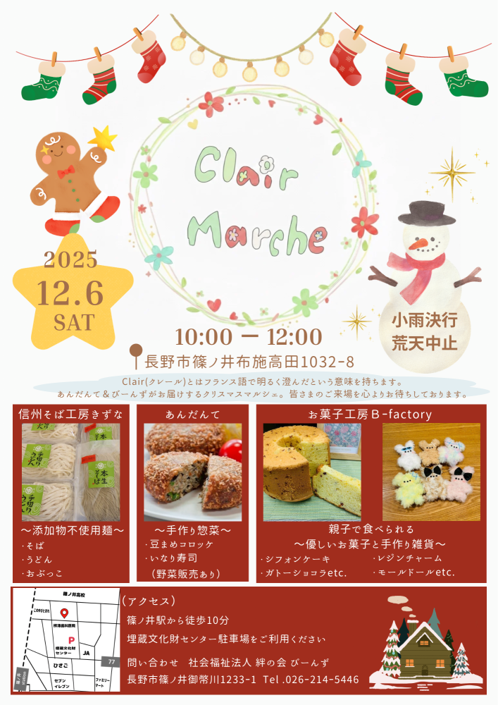 12月に入り、クリスマスの訪れが待ち遠しい季節となりました。 これまで、定期的に開催してきたClair Marche(クレールマルシェ)も、 2度目のクリスマスを迎えました。 販売コーナーでは、おなじみの絆の会定番商品に加え、あんだんてからは 新商品の“こね... -