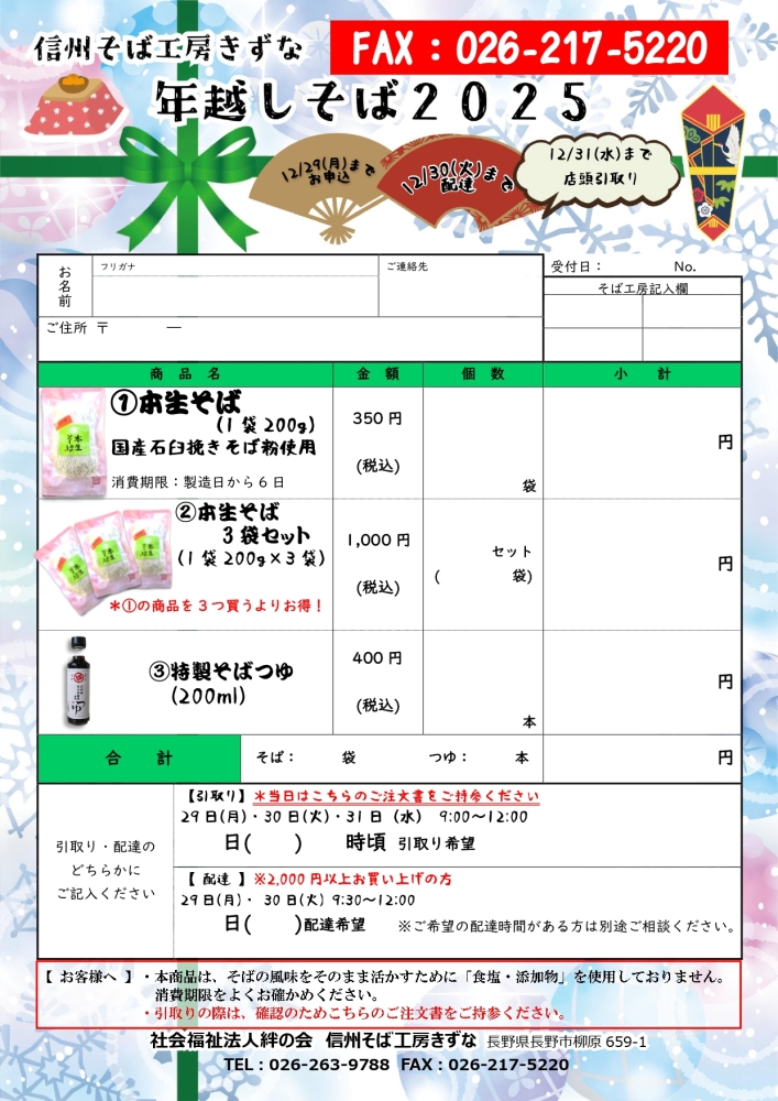今年も恒例となりました、 信州そば工房きずなの 年越しそば のご案内です。お申込みは 12月29日までにFAX にてお願いいたします。チラシはHPのおかいものガイドにも掲載しておりますので、ぜひご覧ください。 🍴 最近のイベントで「本生そば」をお買い上... -